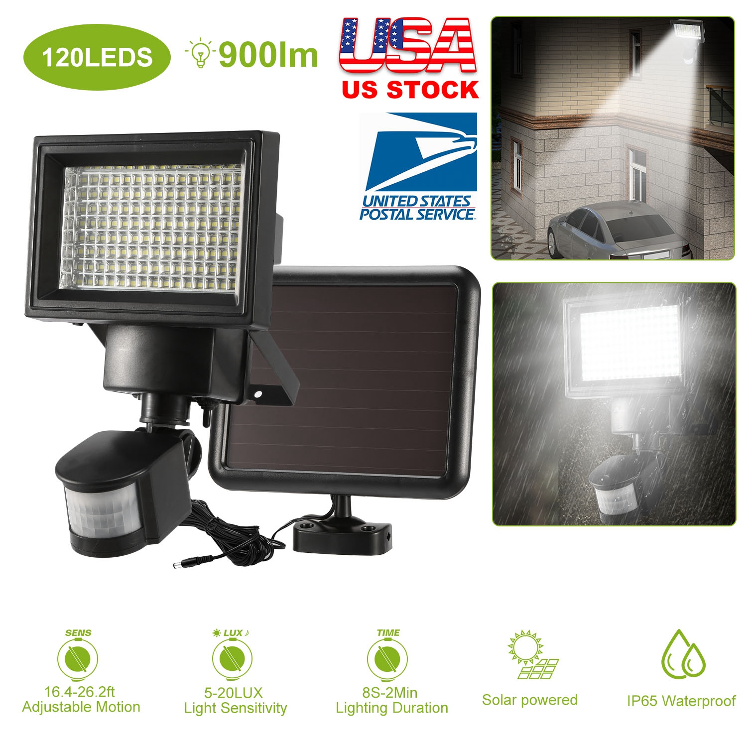 • *120 LEDs Ultra-Bright Solar Powered Lights: Inbuilt bright 120 SMD2835 LEDs with 900lm maximum output and sensitive motion sensor with 120° wide sensing angle which provide up to 180° illumination range and turn the dark space into a bright lighted space for security and safety protection.